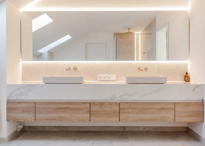 Dieses Badezimmer besticht durch seine minimalistische Gemütlichkeit, durch klare Strukturen und Materialien. Im Zentrum steht die große Waschtischanlage, die mit 2,7 m großzügig und hell von Wand zu Wand verläuft.